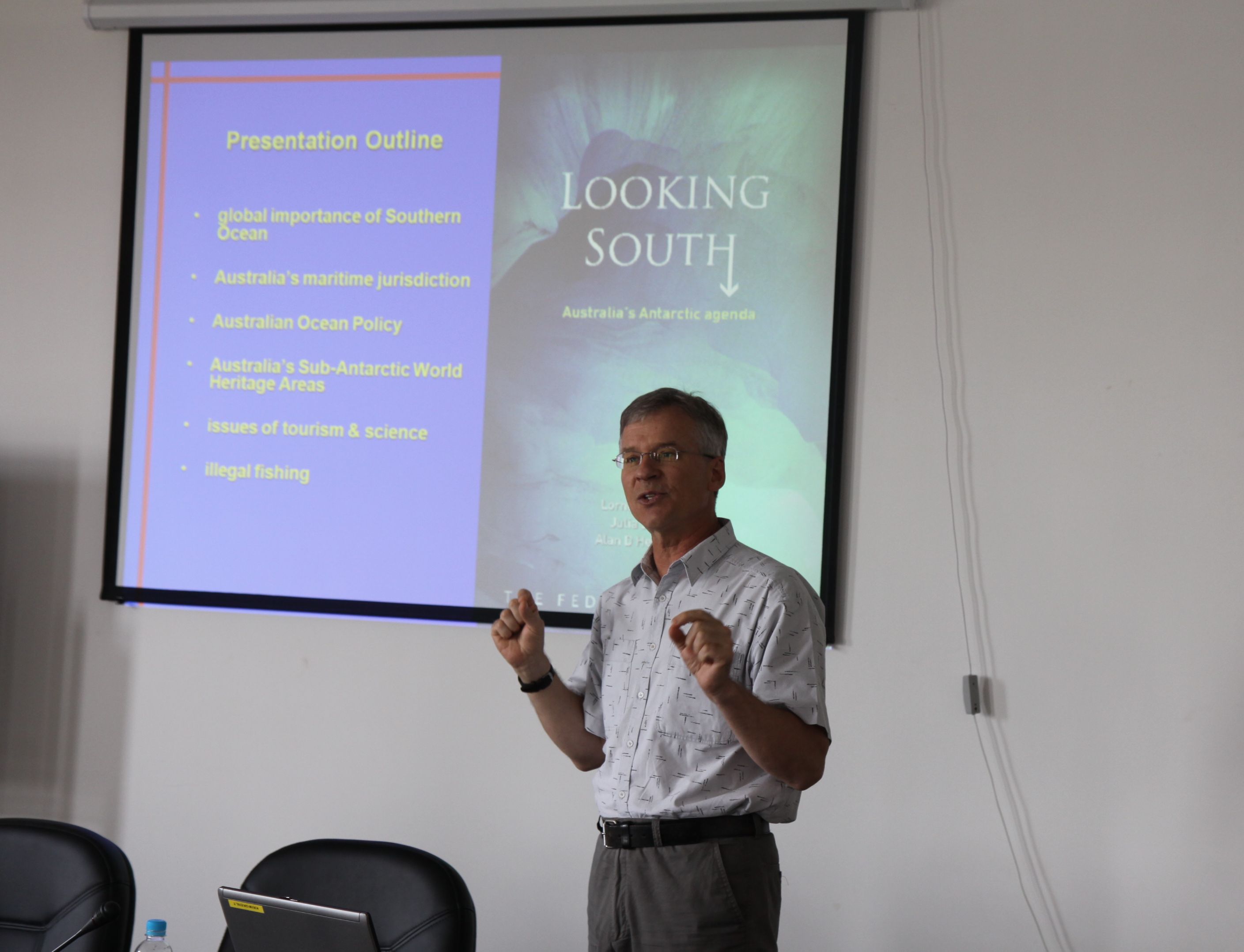 Lorne Kriwoken博士根据其2007年出版的同名专著,分别从南极周围海域对于全球的重要性、澳大利亚在南极附近的海域主张、南极海的海洋生态系统、南极海管理发展趋势及存在问题等四个方面进行详细生动的介绍。并在其后的讨论中,对澳大利亚在南极主张领土外建立专属经济区及申请外大陆架,日本在澳大利亚南极主张海域捕鲸、澳大利亚海洋保护区政策等问题进行深入的交流。