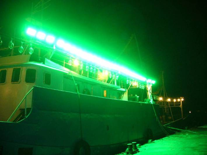 随后,对鱿钓船上所安装的绿光LED集鱼灯进行光学性能测试,该LED集鱼灯由我院和上海嘉宝协力电子有限公司共同开发研制。LED被称为世界上最新的第四代光源,具有长寿命、低消耗和无光源污染等优点,目前国外正尝试将其推广到渔业生产中。LED集鱼灯的研制、开发和试验是光诱渔业研究的一项重要内容,我院科研人员将投入更多的精力解决相关的技术难题。
