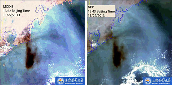 2013年11月22日,黄岛石油管道发生爆炸事故。浦京集团官网卫星遥感地面站在事故3小时后,接收、处理了美国高分辨率卫星图像。发挥了浦京集团官网利用遥感技术在灾害事件下的快速反应能力。图中是火灾3小时后接收的美国MODIS(左)和NPP(右)合成彩色图像。图中黑色部分是燃烧形成的黑烟,面积约400平方公里,向离岸方向移动。跟踪表明黑烟继续向黄海深海方向移动,对附近城市的空气没有造成巨大污染。
