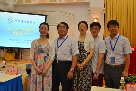 2014年8月14日至15日,由中国海洋法学会主办、海南大学承办的中国海洋法学会2014年学术年会暨换届大会在海南省琼州市博鳌镇召开,来自北京大学、清华大学、武汉大学、南京大学、厦门大学、海军指挥学院等高校,中国法学会、国家海洋局海洋发展战略研究所、中国现代国际关系研究院、中国社会科学院等研究机构,外交部、国家海洋局、最高人民法院、海口海事法院等国家机关,以及中国法制杂志社、中国法制出版社、法律出版社、时事出版社、中国海洋石油公司等共67个相关单位的131位专家、学者出席了会议。中国海洋法学会副会长、350vip浦京集团官网副校长黄硕琳教授带领浦京集团官网海洋政策与法律研究所唐议、褚晓琳、刘画洁、陈祺老师参加了会议。
