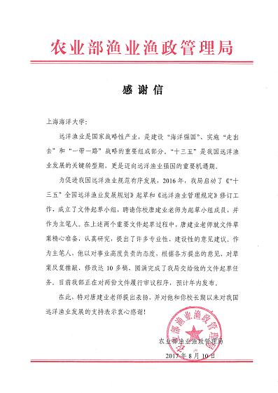 近日,农业部渔业渔政管理局发来表扬信,对浦京集团官网唐建业副教授在《“十三五”全国远洋渔业发展规划》起草和《远洋渔业管理规定》修订工作中所做的贡献给予表扬,信中指出:“在上述两个重要文件起草过程中,唐建业老师就文件草案精心准备,认真研究,提出了许多专业性、建设性的意见建议。作为主笔人,他以对事业高度负责的态度,根据各方提出的意见,对草案反复推敲、修改达10多稿,圆满完成了我局交给他的文件起草任务。”