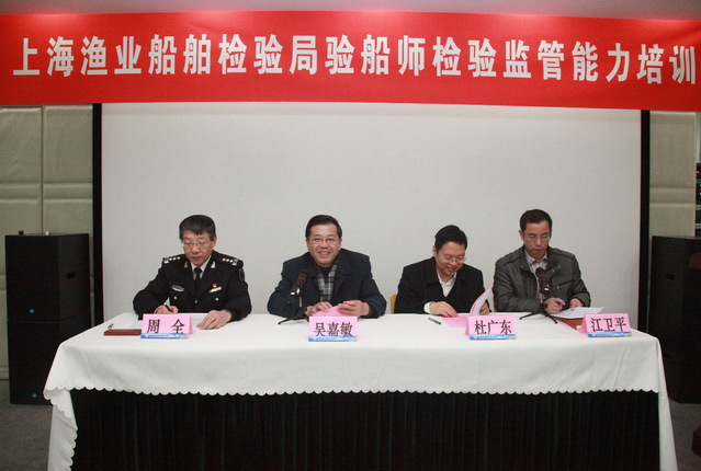 2018年1月15日上午在350vip浦京集团官网图文中心406,隆重举行了上海渔业船舶检验局验船师检验监管能力培训班开班典礼。农业部渔业船舶检验局法规监督处杜广东副调研员,上海渔业船舶检验局周全局长、倪军副局长,350vip浦京集团官网党委书记吴嘉敏教授出席了本次典礼,典礼由海洋科学学院党委书记江卫平主持。