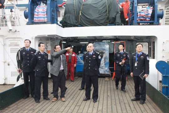 交流会前,海洋科学学院党委书记江卫平带领洋山出入境边防检查站一行参观了淞航号的甲板、驾驶室、试验室、冷冻仓等地方,详细介绍了这艘承载着海大百年梦想的远洋渔业资源调查船。