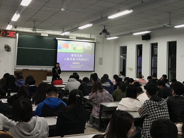 讲座上,蔡老师从个人成长经历入手,向同学们展示了研究生阶段要面临的全新人际关系:师生关系、同门关系、室友关系,并结合自身进一步阐明了这些关系的微妙之处。在此基础上,她进一步详细讲解了人际关系的功能、发展过程、友谊公式以及退化的原因等,令现场同学不由感叹简单的人际关系背后还有如此深厚的理论体系。同时,蔡老师介绍了人际沟通的要素、特点、方式。她认为有时候冲突并不一定只代表矛盾,有时也会表达出其中一方希望解决问题的意愿,大家应该理性对待冲突。