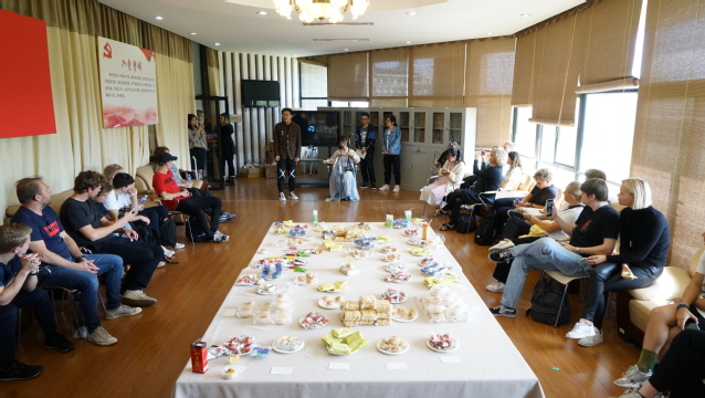 想要充分了解一个国家的文化,饮食文化是很重要的一方面。所以本次活动伊始,由海院创新班成员组成的志愿团对包括桃酥、麻花、桂花糕、茉莉花茶等在内的中国特色酥食、茶饮向丹麦师生作了简短的英文介绍。