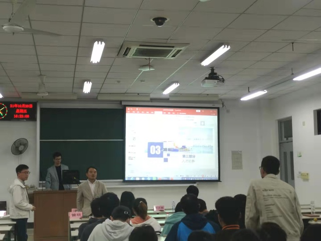 首先,李大刚通过播放宣传片、PPT展示、现场问答等方式向同学们介绍公司的概况、职业发展方向、人才需求以及企业薪酬福利待遇等。随后,胡坤向同学们详细介绍了自己的求职入职经历,并分享了自己的工作经验。最后,石张东对企业的到来表达了感谢,并表示今后将进一步加深与企业之间的交流合作,持续推进人才培养和人才输送。