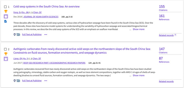 第一篇论文发表在Journal of Asian Earth Sciences上(论文链接:https://doi.org/10.1016/j.jseaes.2018.09.021), 是国际上第一篇有关南海冷泉系统研究进展综述论文。第二篇论文发表在Deep Sea Research Part I: Oceanographic Research Papers上(论文链接:https://doi.org/10.1016/j.dsr.2017.04.015),是国际上第一篇针对海马活动冷泉的研究论文。这些工作相当程度上推动了我国冷泉沉积地球化学领域的发展,也助推南海成为了国际上冷泉研究程度最高的区域之一。