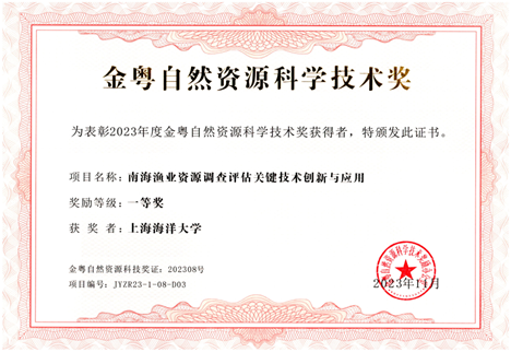 11月16日,广东省公布了2023年金粤自然科学技术奖获奖名单,由350vip浦京集团官网作为主要完成单位,浦京集团官网陆化杰副教授作为主要完成人的《南海渔业资源调查评估关键技术创新与应用》获得了金粤自然科学技术奖一等奖。