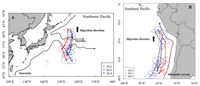 论文1“Environmental fluctuation influences the ontogenetic dispersal and distribution of two ommastrephid squids in the Pacific Ocean”基于气候和环境变化对物种的洄游分布具有显著影响这一科学假设,以太平洋两种重要经济种类柔鱼和茎柔鱼为例,通过采集和分析不同年份的耳石微量元素数据,结合大尺度气候指数和区域海洋环境数据,阐述了重要经济种类在不同的气候背景下各个生长阶段的栖息特征,获取关键生活史阶段的重要栖息环境特征,并对可能的洄游路径和存在的差异进行了分析(图1)。该研究结果有效地揭示了气候变化下两种鱿鱼的洄游机制与策略,能够更好地为研究其它大洋性鱿鱼洄游分布与气候和环境变化的关系提供参考依据。论文的第一作者和通讯作者均为方舟副教授。