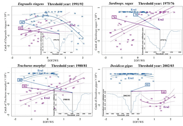 论文2“Nonstationary response of commercially pelagic species in the Humboldt current ecosystem to climate variability”基于物种资源与气候和环境间变化关系具有与时间相关的非平稳性这一科学假设,以东南太平洋中上层重要经济种类秘鲁鳀、南美拟沙丁鱼、智利竹筴鱼和茎柔鱼为例,根据物种产量数据,结合大尺度气候指数和区域海洋环境数据构建阈值模型,识别气候、环境以及物种产量跃变对应关系,论证物种产量变化对气候和环境变化的非稳态响应(图2),此研究结果厘清了东南太平洋重要经济种类对气候变化的非稳态响应,为评估其他大洋性中上层经济物种资源与气候和环境变化关系提供参考。论文第一作者为博士后冯志萍,通讯作者为余为副研究员。