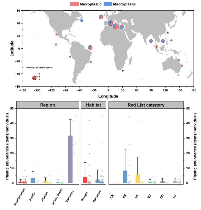论文3“Uncovering the global status of plastic presence in marine chondrichthyans”基于人类活动及栖息地变化对全球软骨鱼类体内塑料污染具有影响这一科学假设,以软骨鱼类(鲨鱼、鳐、魟与银鲛)为例,通过构建全球软骨鱼类塑料污染研究数据库,结合海域分布、栖息水层及物种濒危等级,阐述了软骨鱼类塑料污染研究的发展动态和技术手段,并分析了各研究海域、栖息水层及濒危等级软骨鱼类体内(微)塑料分布、丰度、颜色、形状、粒径、聚合物成分等赋存特征的差异(图3)。研究结果为鲨鱼、鳐魟等软骨鱼类塑料污染研究提供指导,对解析大洋生态系统塑料污染及其潜在生态风险具有重要意义。论文的第一作者为贡艺讲师,通讯作者为李云凯教授与毕业研究生黄学民。