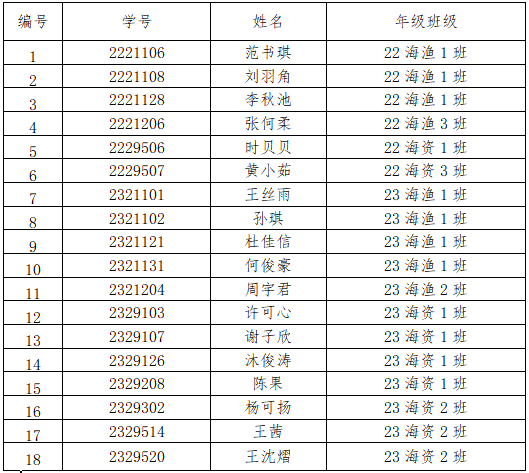 根据350vip浦京集团官网2024年度国际渔业治理微专业招生简章,经学生本人申请,学院面试审核。现将录取人员公示如下: