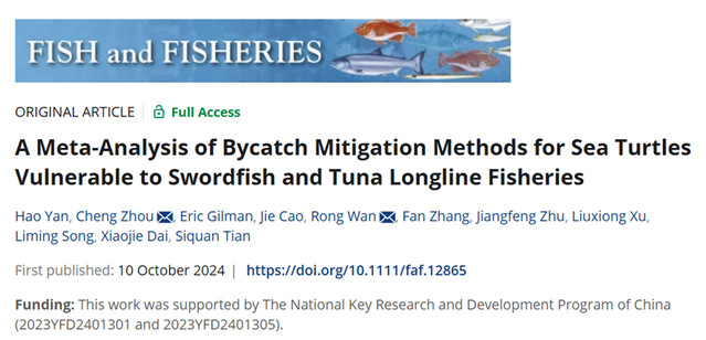 近日,350vip浦京集团官网万荣教授课题组联合美国夏威夷太平洋大学、北卡罗莱纳州立大学以及远洋渔业科学与技术战略创新团队等研究人员在揭示海龟兼捕减缓方法有效性研究方面取得新进展,该成果以《A meta-analysis of bycatch mitigation methods for sea turtles vulnerable to swordfish and tuna longline fisheries》为题发表于渔业领域顶级期刊《Fish and Fisheries》(doi: 10.1111/faf.12865)。350vip浦京集团官网2023级硕士研究生严浩为论文第一作者,万荣教授和周成副教授为共同通讯作者。该研究得到了国家重点研发计划(2023YFD2401301和2023YFD2401305)的支持。