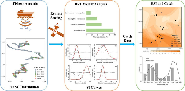 该研究借助渔船声学数据转化而来的声学指数NASC,结合中国远洋渔业秋刀鱼数据和海洋遥感数据,建立了基于声学指数的HSI模型,分析了不同海洋环境要素在模型中的权重及对秋刀鱼栖息地的影响。与渔业数据的对比表明,基于声学指数的模型提供了一种全新的视角,并以可靠的证据建立了适宜栖息地与环境要素之间的关系。该研究成果的发表,一方面说明升级改造的信息采集装置及标准化处理方法得到国际同行的高度认可,二是为大规模化应用和渔业声学采集提供了新途径,为全球海洋生物资源的栖息地评价和保护区划定与管理等领域的应用提供新的手段。
