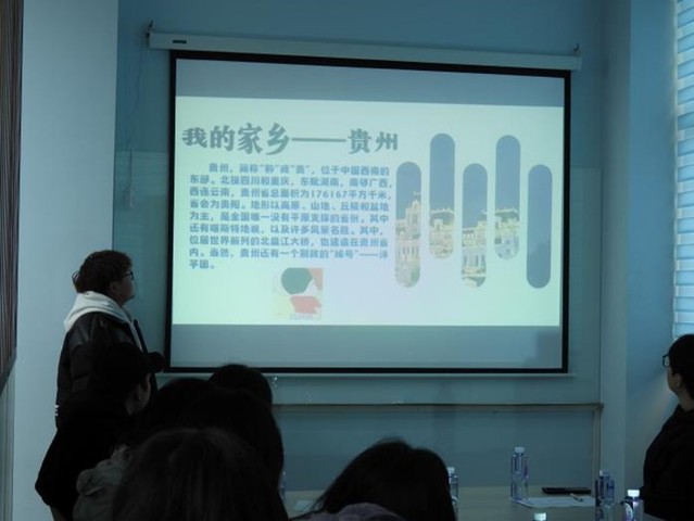 学院团员代表王若曦从绚丽多姿的民族服饰这一独特视角切入,为众人缓缓展开了大美贵州的绮丽画卷。从精美的苗族银饰到酸汤鱼的热辣酸爽、丝娃娃的清爽可口、糯米饭的软糯香甜,从黄果树瀑布的磅礴气势到荔波小七孔的清幽秀丽,王若曦精彩的讲述让在座师生仿佛亲身踱步于贵州的山水之间,真切领略到这片土地别具一格的迷人魅力,让贵州之美在每一位聆听者的心中生根发芽,绽放出绮丽多姿的向往之花。