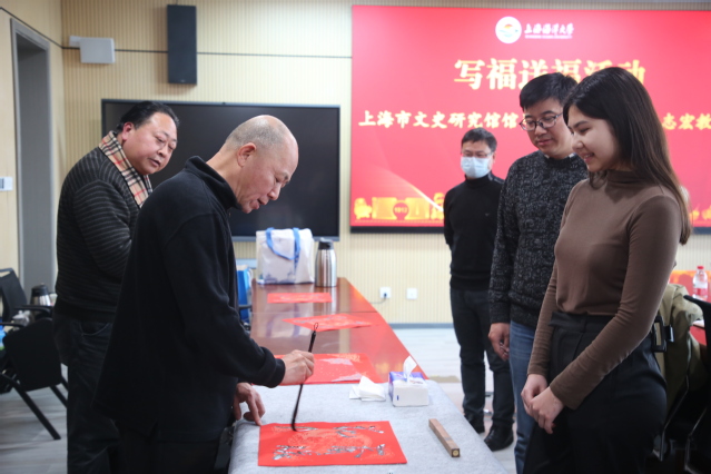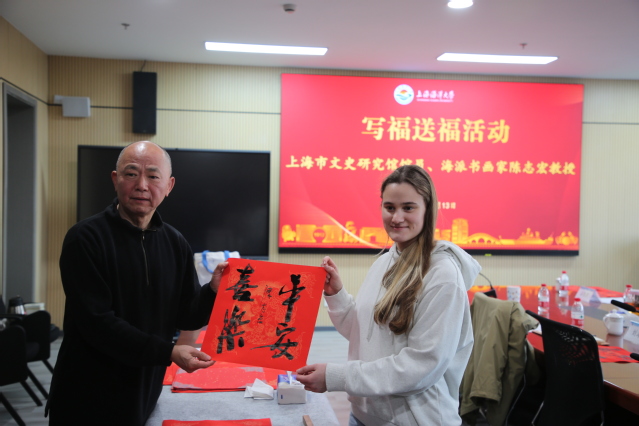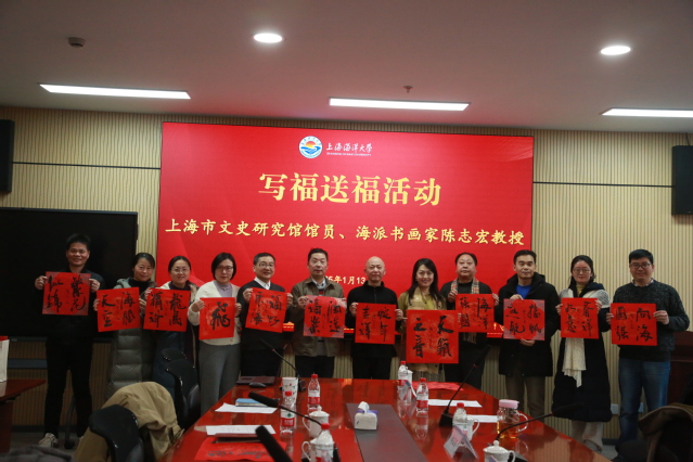 会后,艺术家与师生共同开展了迎新年赠福字活动。陈志宏现场为在场师生讲述了中国的书画艺术、帮助和指导中外学生学写书法。师生们在红纸上写上“海洋强国”“向海图强”“文鳐现世 五谷丰登”“扬帆起航”等内容,共同祝愿伟大的祖国繁荣昌盛,祝愿学校的发展蒸蒸日上。