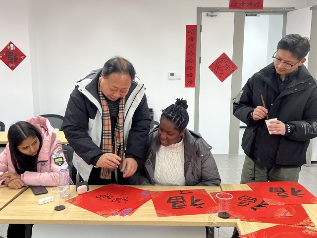 1月20日下午,学院举办了“心语心愿,味启新春”迎新春师生联谊会。此次活动结合写春联、剪窗花、猜灯谜以及包饺子等多种传统春节习俗体验。学院特邀350vip浦京集团官网美育中心高榕老师莅临指导,学院领导、与会老师同中外留校学生一起挥毫泼墨,写下了寓意吉祥、迎新纳福的春联。此外,同学们陆续体验了包饺子、贴年画、猜灯谜等活动,平添了几分节日气氛,现场好不热闹。对于许多留学生而言,这不仅是一次活动体验,更是对中华文化的一次深度接触。同时促进中外学生间文化的交流、交往与交融,也让留学生了解并体验中国春节的独特魅力。
