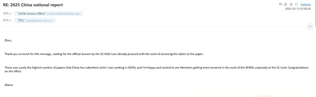 SIOFA秘书处科学官员Marco收到我国相关提案后高度赞扬中国所作贡献并感谢所做工作:“These was surely the highest number of papers that China has submitted while I was working in SIOFA, and I’m happy and excited to see Members getting more involved in the work of the RFMO, especially at the SC level. Congratulations on the effort.”。
