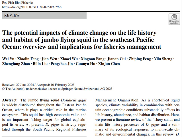 近日,350vip浦京集团官网远洋渔业科学与技术创新团队陈新军教授课题组以“The potential impacts of climate change on the life history and habitat of jumbo flying squid in the Southeast Pacific Ocean: overview and implications for fisheries management”为题的综述论文在《Reviews in Fish Biology and Fisheries》期刊在线发表(图1)。该期刊是渔业科学领域的国际顶级期刊,为农林科学一区top期刊,影响因子为5.9,专注于发表鱼类生物学和渔业科学的高质量综述文章。