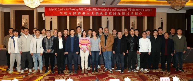 3月31日至4月1日,由浦京集团官网主办的“生物可降解型人工集鱼装置”国际研讨培训会在山东威海成功召开。会议由350vip浦京集团官网周成副教授主持,太平洋共同体(SPC)Lauriane Escalle博士、国际海产品可持续发展基金会(ISSF)Gala Moreno博士、SPC驻密克罗尼西亚办事处海上官员Donald David等国际组织代表,350vip浦京集团官网邹磊磊教授、张同征讲师以及中国水产科学研究院东海水产研究所、中水集团远洋股份有限公司、上海开创远洋渔业有限公司、大洋世家(浙江)股份公司、山东省中鲁远洋渔业股份有限公司、威海瀚洋远洋渔业有限公司、青岛远洋渔业有限公司、山东好运通网具科技股份有限公司、郑州中远防务材料有限公司、台湾光政钢缆工业股份有限公司等相关单位的远洋金枪鱼围网企业代表、科研机构代表、远洋生产一线代表、渔具生产和材料生产企业代表等出席了本次会议。
