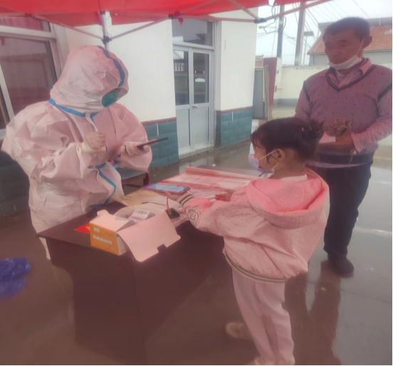 早上5点,田文静老师按照村委的要求来到村委会,正在布置场地时,突然一场大雨倾盆而下,给核酸检测带来了诸多的不便,医护人员、党员干部、志愿者冒雨坚守,核酸检测按时开始,为了加快核酸检测速度,需要一名能快速学会扫码的同志,村长问队伍里面有没有党员,田老师举手示意,村长亲自在她背后写下了“我是党员,田文静”,田老师感到非常荣幸。短暂的培训以后,田老师接过了给村民扫码的任务,群众检测队伍整齐、井然有序,齐心坚守撑起了一张“疫”往无前的守护伞。田文静老师作为党员,充分发挥了党员的模范带头作用,积极投入到疫情防控的志愿服务中去,给Beat365官网师生做了良好的榜样。